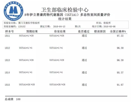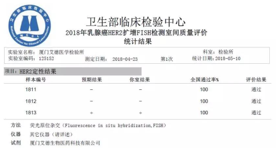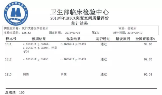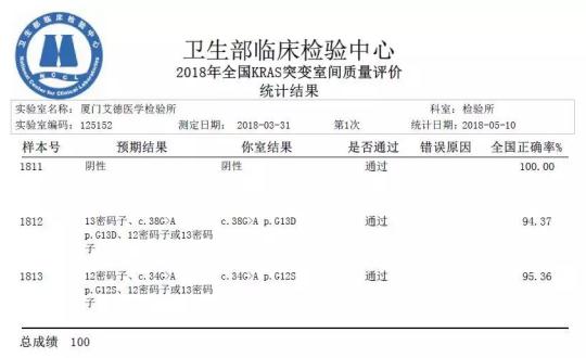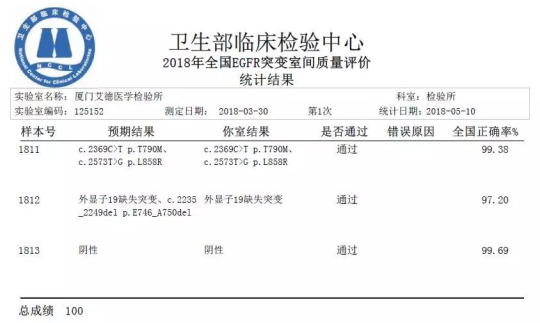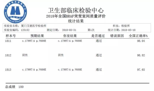 2018年5月,廈門艾德醫(yī)學(xué)檢驗所再次以7個項目全滿分通過了由衛(wèi)生部臨床檢驗中心(NCCL)組織的2018年上半年(第一輪)全國臨床檢驗實驗室質(zhì)量評價,彰顯艾德生物恪守規(guī)范、精益求精的品質(zhì)追求!自成立以來,艾德醫(yī)學(xué)檢驗所連續(xù)多年積極參加國內(nèi)外各權(quán)威機構(gòu)組織的各項室間質(zhì)評及能力驗證項目,以滿分的佳績證明其在腫瘤分子診斷上的硬實力!