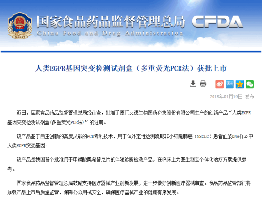 2018年1月19日,中國食品藥品監(jiān)督管理總局(CFDA)通過創(chuàng)新醫(yī)療器械特別審批通道,批準艾德生物的Super-ARMS®EGFR基因突變檢測試劑盒,用于臨床檢測晚期非小細胞肺癌(NSCLC)患者血液ctDNA中EGFR基因突變狀態(tài),篩選適合接受一代至三代EGFR靶向藥物治療的患者。這個以伴隨診斷試劑標準獲批上市的ctDNA檢測試劑盒,將開啟腫瘤液體活檢的新里程!
