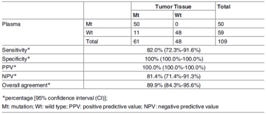 一項(xiàng)公開(kāi)發(fā)表的研究數(shù)據(jù)驗(yàn)證ADx-SuperARMS技術(shù)是一種高靈敏、高特異的可用于無(wú)創(chuàng)檢測(cè)晚期NSCLC患者血漿EGFR突變檢測(cè)的方法,檢測(cè)結(jié)果可有效預(yù)測(cè)一代EGFR-TKIs的療效。