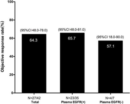 此外,研究團(tuán)隊(duì)還追蹤了42例組織EGFR檢測(cè)陽(yáng)性、腫瘤可評(píng)估且接受了EGFR-TKIs一線治療的入組患者的療效觀察。結(jié)果顯示,27例(64.3%)達(dá)到部分緩解(PR),14例(33.3%)為疾病穩(wěn)定(SD),1例(2.4%)為疾病進(jìn)展(PD);客觀響應(yīng)率(ORR)和疾病控制率(DCR)分別為64.3%和97.6%。其中血漿EGFR檢測(cè)陽(yáng)性且接受EGFR-TKIs一線治療的35例入組患者中,PR 23例(65.7%),SD 11例(31.4%),PD 1例(2.9%);ORR和DCR分別為65.7%和97.1%,與組織陽(yáng)性人群結(jié)果十分相似,而血漿陰性組織陽(yáng)性人群的ORR則為57.1%。(4/7)(圖2)。截至統(tǒng)計(jì)日,入組人群的無(wú)進(jìn)展生存期(PFS)和總生存期(OS)尚未達(dá)到,繼續(xù)隨訪觀察。