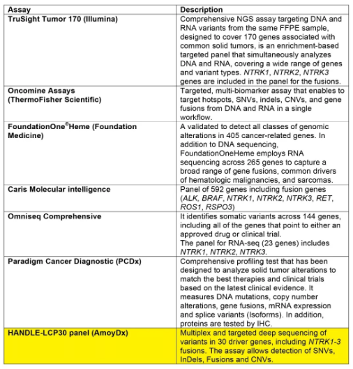 近期,歐洲腫瘤內科學會(ESMO)在線發(fā)表NTRK基因融合檢測標準方法相關共識,將艾德生物AmoyDx® HANDLE Classic NGS Panel(供應海外市場,以下簡稱LCP-30 Panel)作為NTRK融合檢測的推薦NGS產品之一。