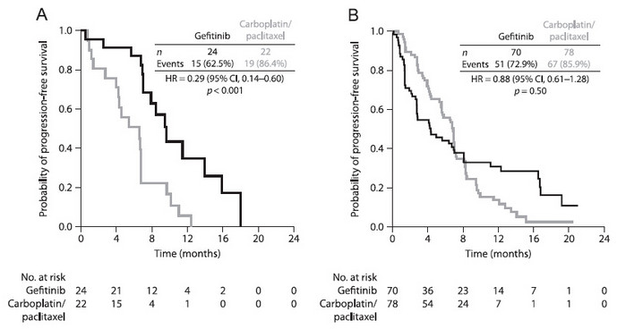 圖1 IPASS日本研究中血漿EGFR陽性(A)和陰性(B)的NSCLC患者PFS曲線